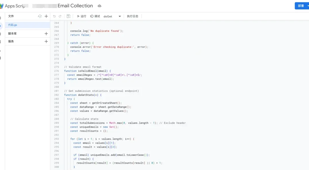 Here’s a case from my actual work using a content hook on a website to capture user emails and other info. Its logic is similar to the automated report’s Google Apps Script project — both automate writing content to Google Sheet reports. Of course, the email capture part needs separate development on the website side.