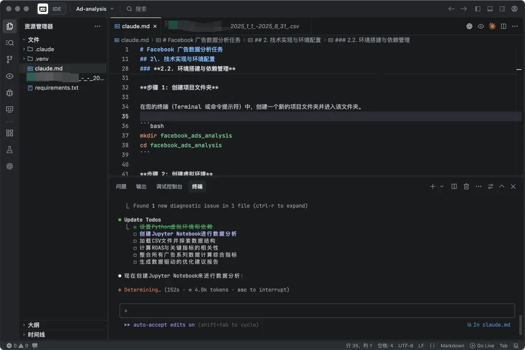 For this claude.md document, you can follow Mr. Guo and reply “claude data analysis” in the backend to get it. Just put your Facebook ad data + this claude.md in one directory, throw it to Claude Code, and tell it “execute tasks according to claude.md” — you’ll get analysis reports identical to mine.