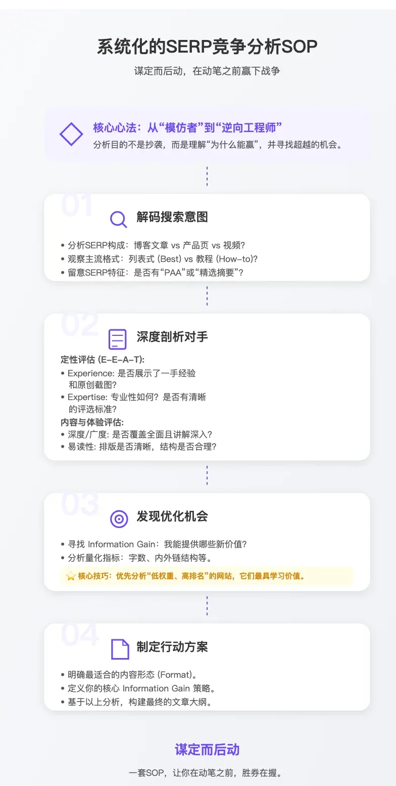 故事的起点,平淡无奇。我正在使用AI辅助我规划了一篇关于“SERP竞争分析”的番外篇。反复迭代了几次后,最终确立了一套包含“心法、解码意图、剖析对手、发现机会、制定方案”等核心步骤的SOP。
