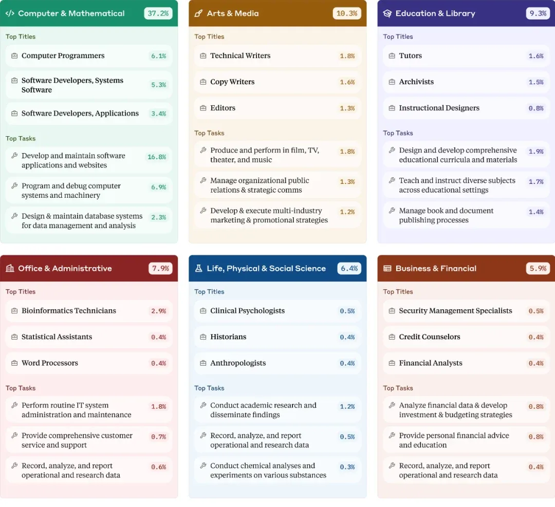 该研究通过分析数百万次Claude.ai的真实对话,揭示了当前AI在经济任务中的实际应用模式。一个显著的发现是,AI的使用目前高度集中于软件开发与写作任务,这两者几乎占据了AI总使用量的半壁江山。