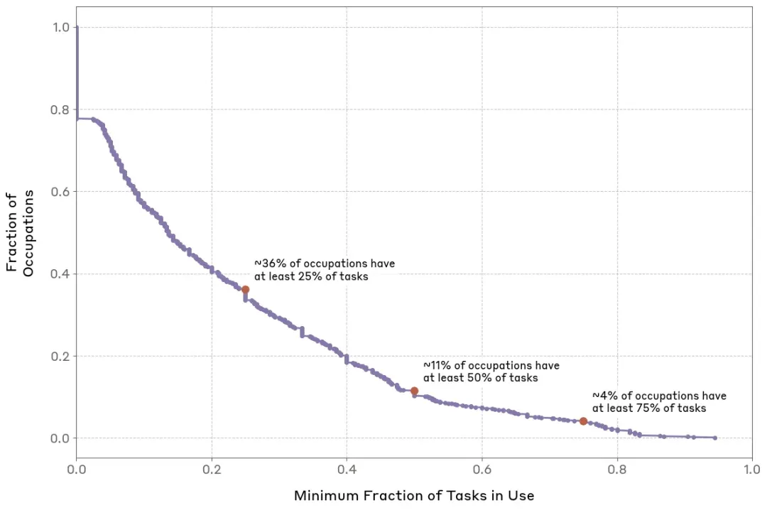 图注:AI在不同职业中的任务渗透深度差异显著,深度整合仍有较大空间(来源:Anthropic, 2025)