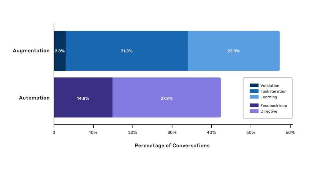 图注:研究表明,目前近六成AI应用旨在增强人类能力,而非完全自动化(来源:Anthropic, 2025)