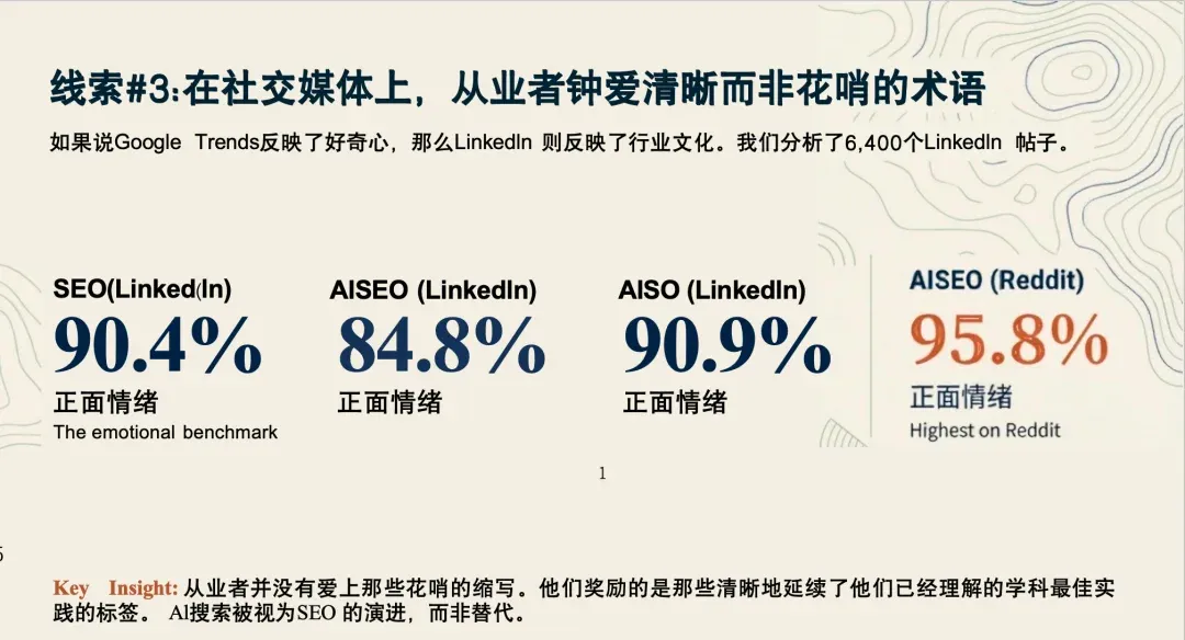 社媒上最受宠的词依然是 SEO(90.4% 正面情绪)。落地依赖内容结构、Technical SEO 与实体权威性。