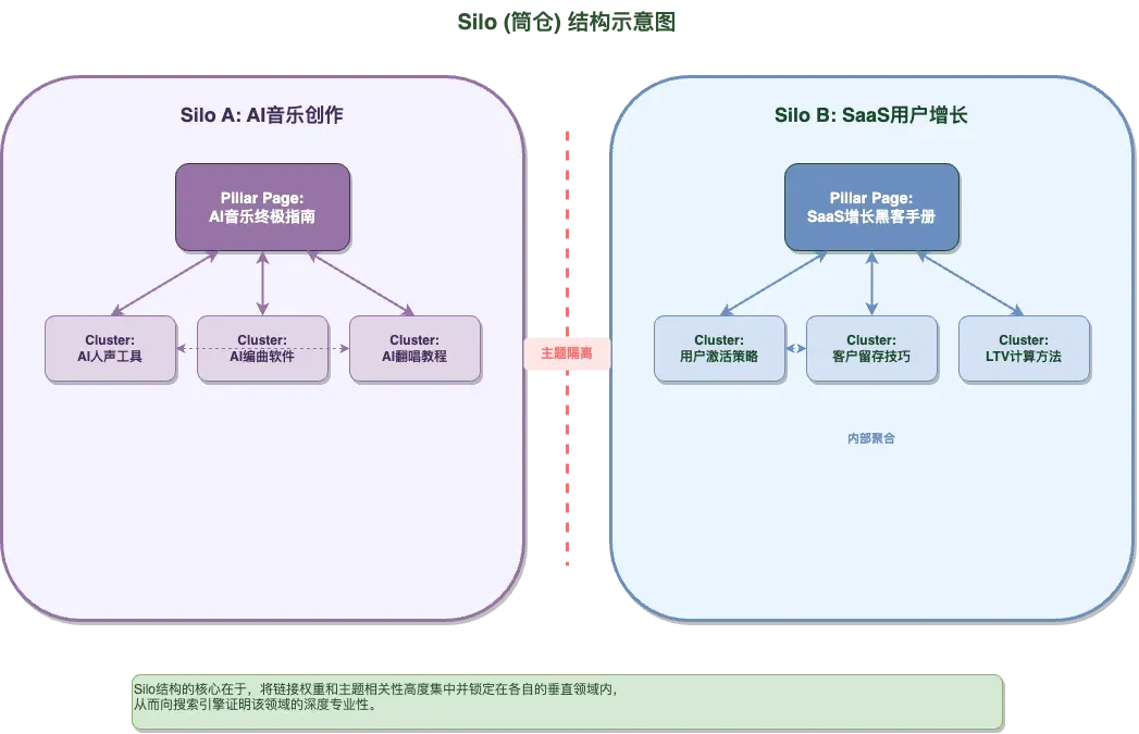 - Silo(筒仓)结构:这正是“中心-辐射”模型在链接层面的完美体现。Silo的核心思想是“主题隔离”。想象一下农场里一个个独立的筒仓,每个筒仓只装一种谷物。在网站上,一个Silo就是一个主题集群。你将所有关于“AI音乐生成”的链接(Pillar和Cluster之间)都严格地保持在这个“筒仓”内部,避免将它们随意链接到“SaaS用户增长”等其他不相关的主题。这样做的好处是,它极大地增强了Google对你特定主题专业性的认知,将权重和相关性高度集中。
