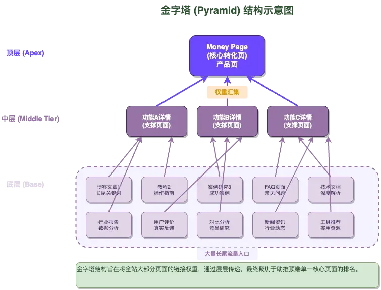 - **金字塔(Pyramid)结构:**这种结构更注重于将整个网站的权重(Link Equity)由下至上地汇集到金字塔顶端的某个核心页面,通常是首页或最重要的“赚钱页面”。底层是大量的博客文章,它们链接到中层的分类页或次级产品页,最终所有链接都指向顶层的核心页面。它的目标是集中全站之力,推高一个页面的排名。