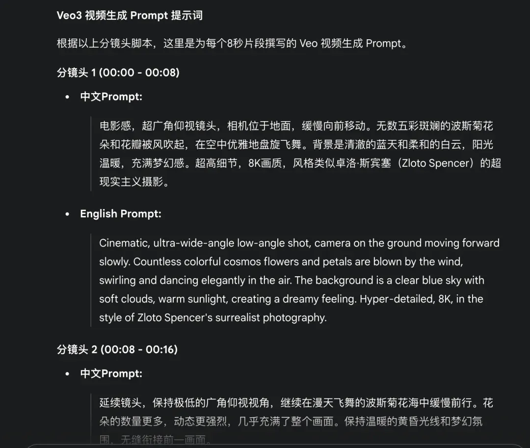 得到分镜头脚本后,下一步是让 Gemini 将这些描述性的脚本,转化为可供文生视频模型执行的、充满画面感的 Prompt。指令如下: