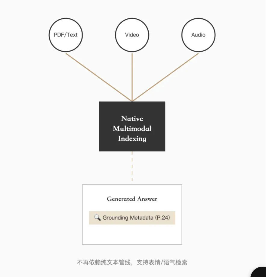 Gemini File Search 的护城河在于原生多模态摄取能力与极客级分块控制。它支持直接索引视频与音频,并在多模态向量空间中检索,不再依赖纯文本管线。