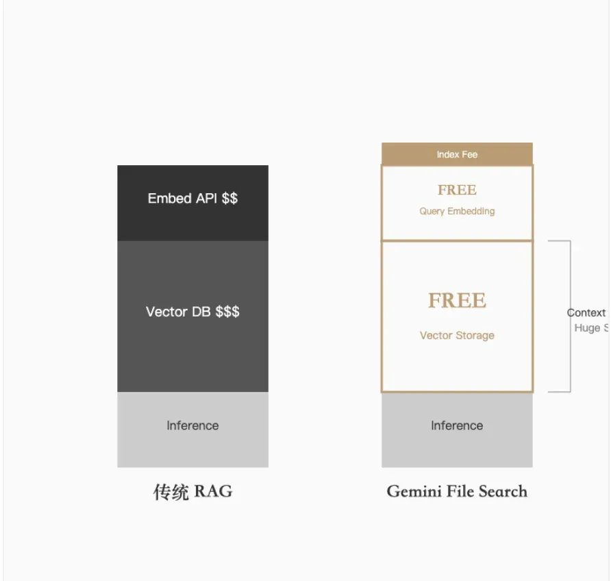 传统 RAG 成本包含嵌入、向量存储与推理输入;Gemini 将存储与查询时嵌入成本归零,仅对索引与推理输入计费。