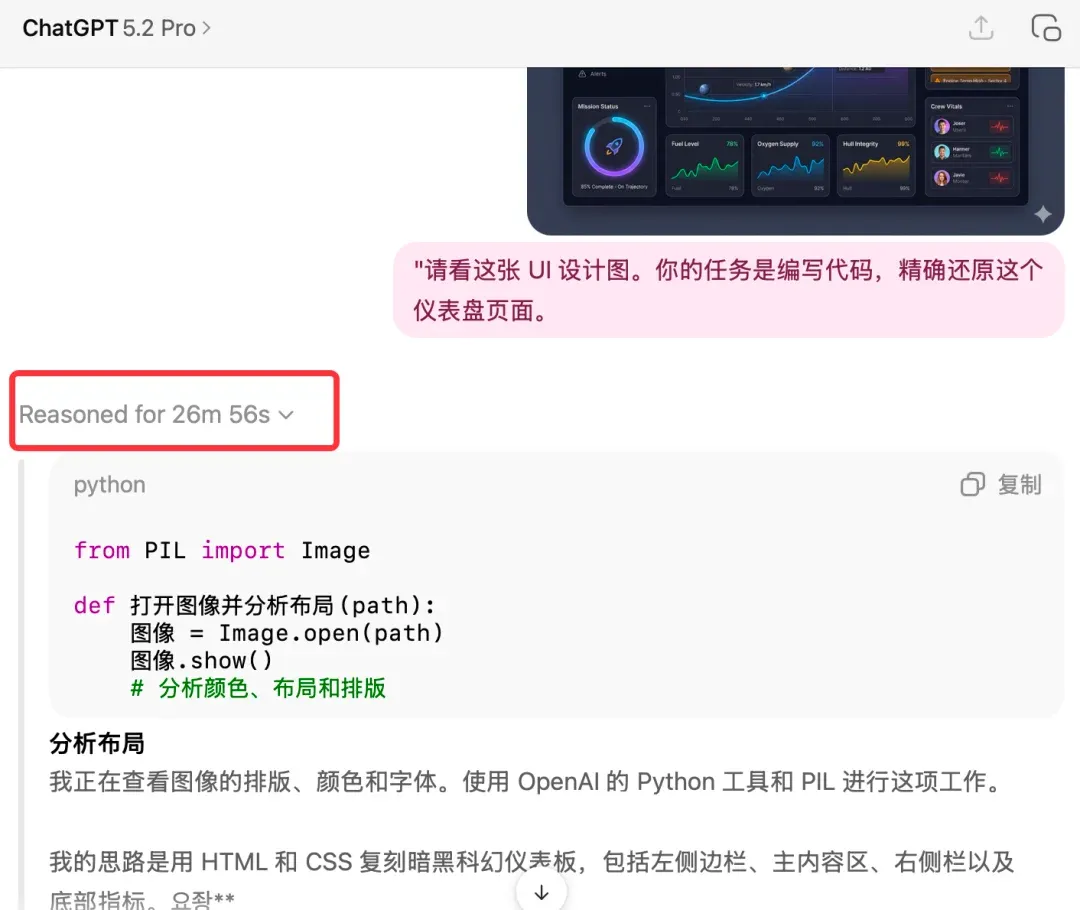刚才我测试了一张带有复杂图形层级的 UI 设计图。GPT-5.2 不仅还原了布局,甚至准确识别了设计意图中的**“视觉层级(Visual Hierarchy)”**。