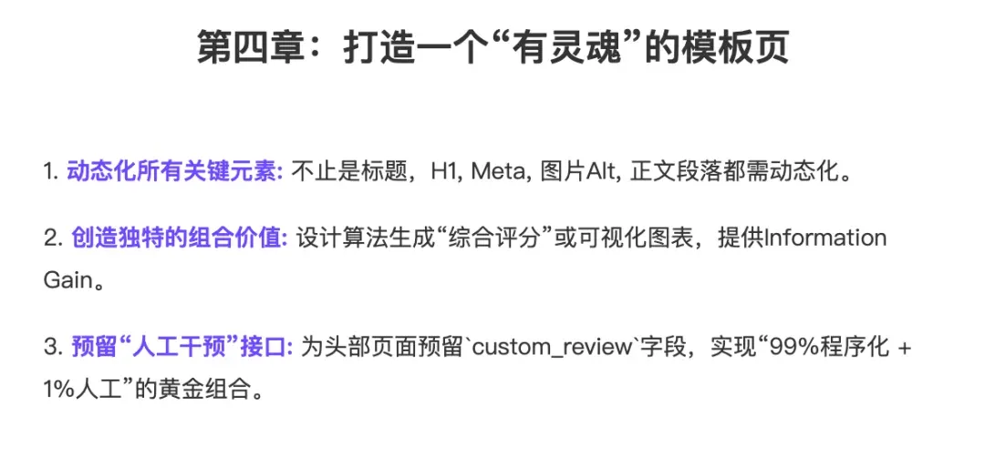 这是pSEO项目成败的关键,也是我们与低质量“内容农场”划清界限的地方。一个好的模板,必须确保每一个自动生成的页面,在Google和用户眼中,都是独一无二且有价值的。