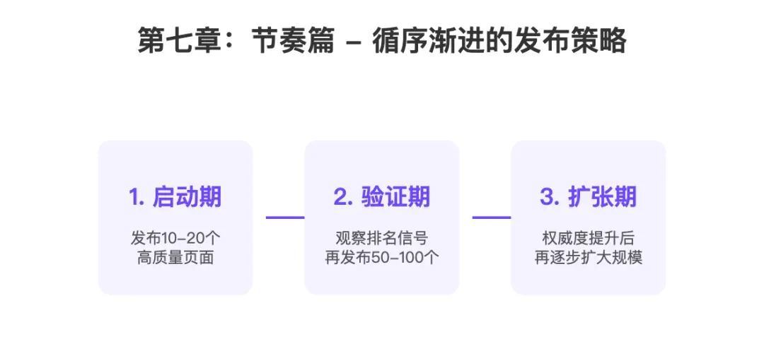 验证期: 观察这批页面的收录和排名情况。当它们开始获得一些流量和信任信号后,再进行第二批(例如50-100个)页面的发布。