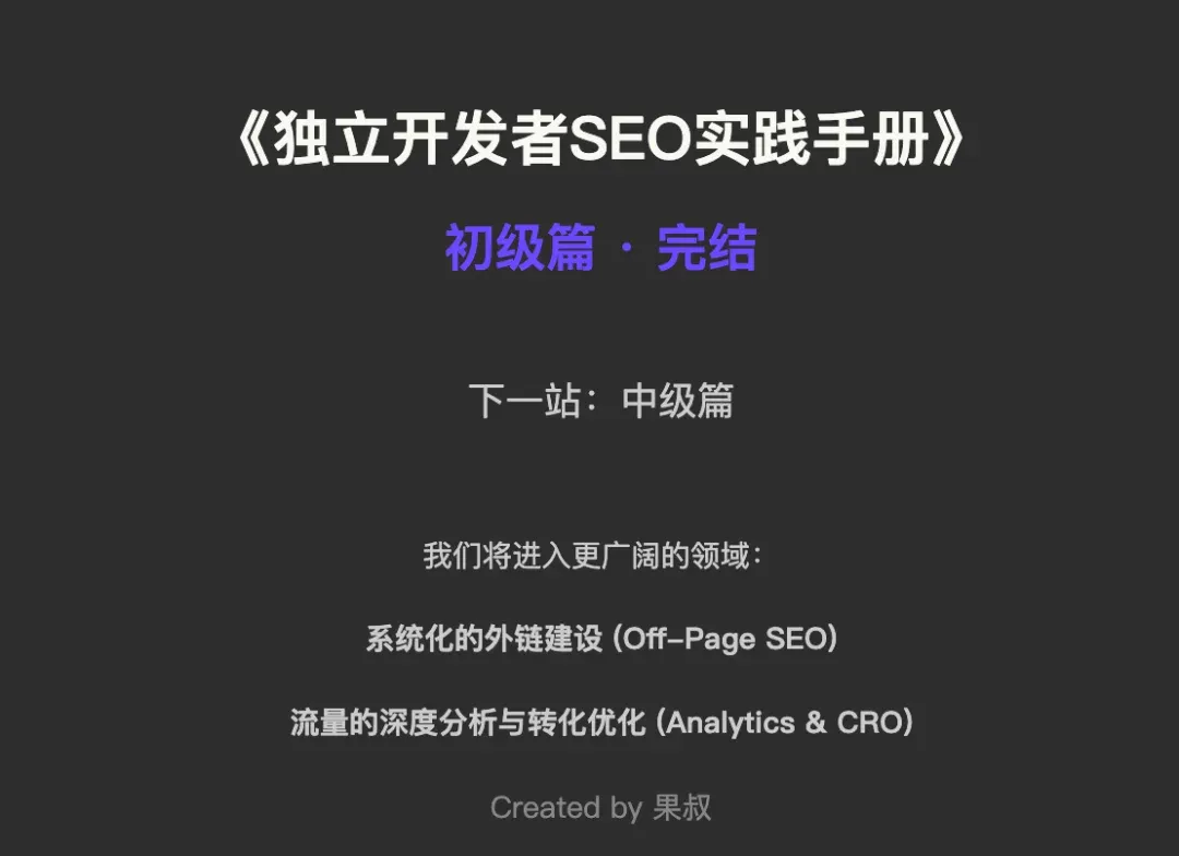 随着这篇文章的结束,《独立开发者SEO实践手册-初级篇》也画上了一个圆满的句号。我们一起建立了坚实的技术地基,掌握了内容战略与生产的核心SOP。